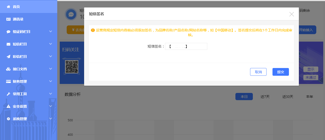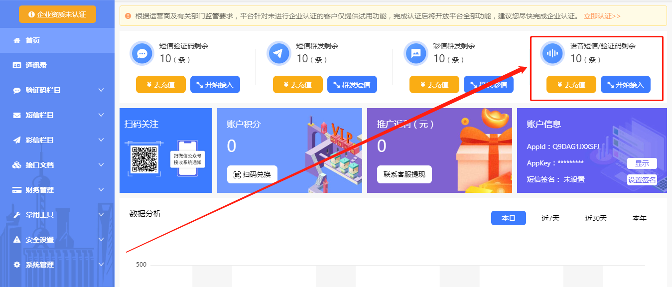 企业用户未认证之前,仅提供平台试用功能,限制发送短信内容及短信条数,不可自定义模板,仅允许使用系统内置模板。企业可以提交营业执照等信息完毕后,开放平台全部功能,