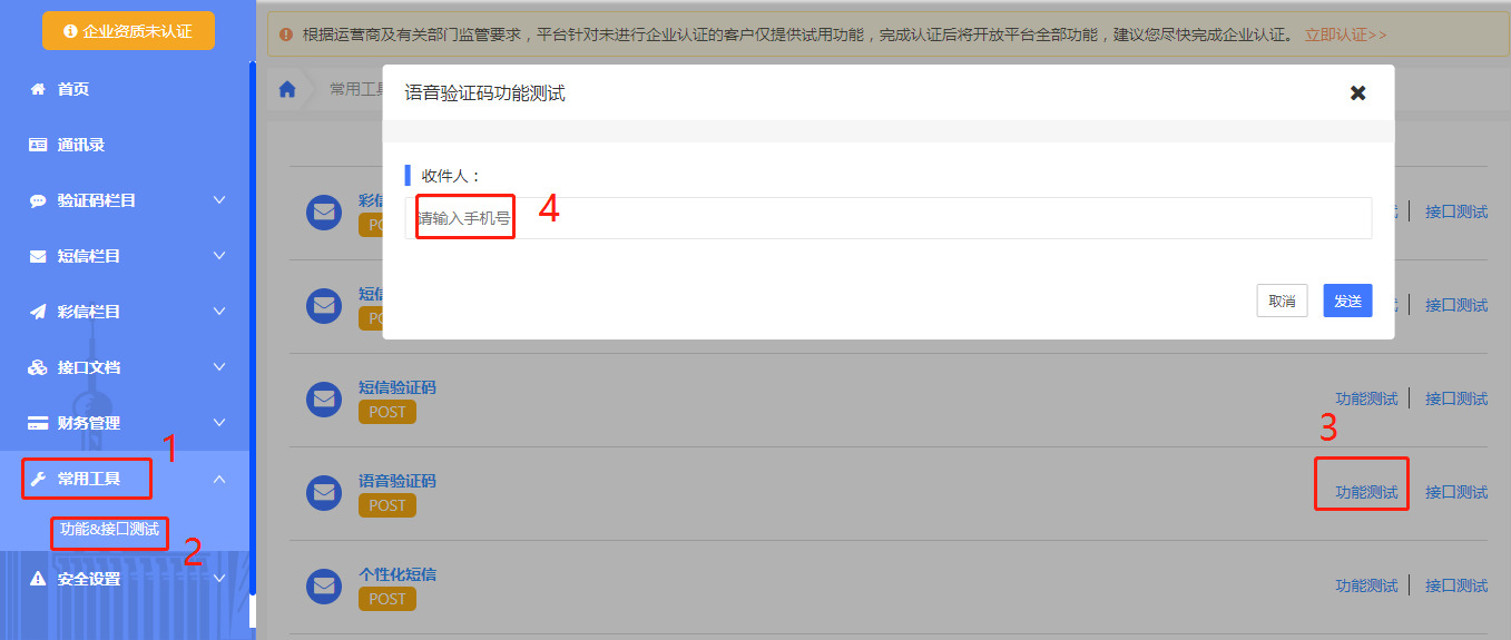 左侧菜单栏“常用工具”--“功能&接口测试”--“语音验证码功能测试”,输入手机号码即可体验语音验证码服务。