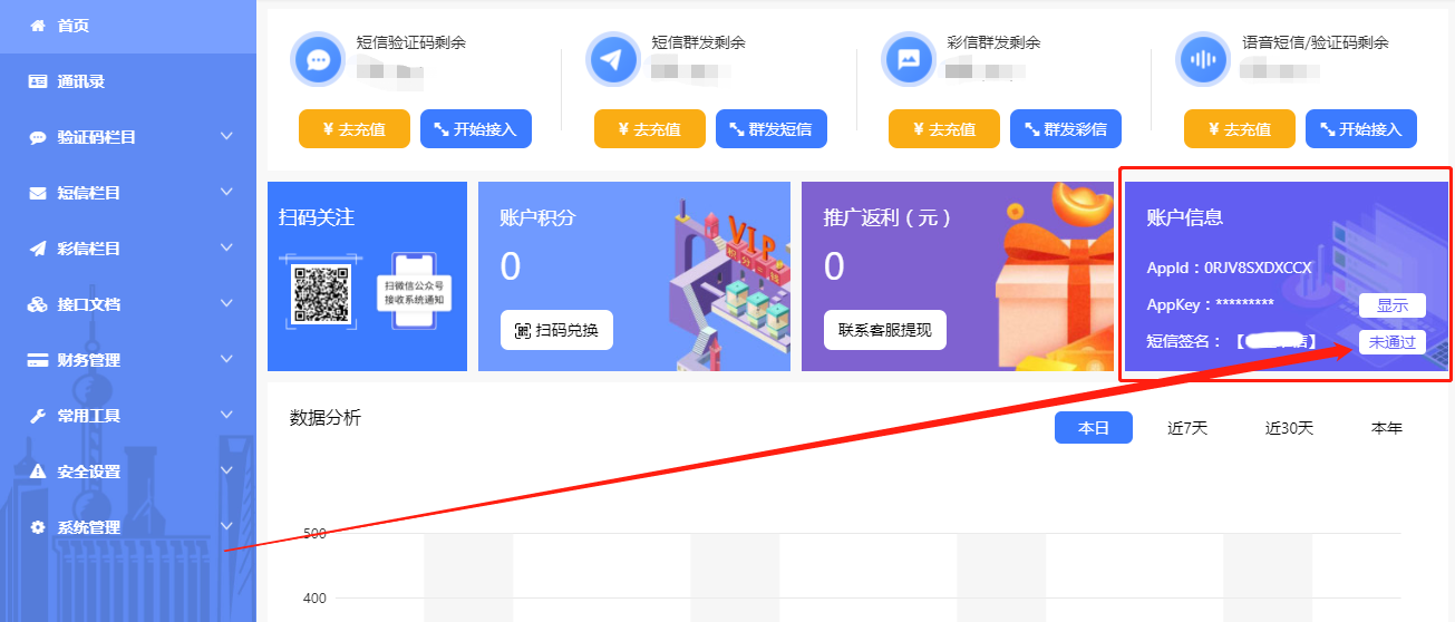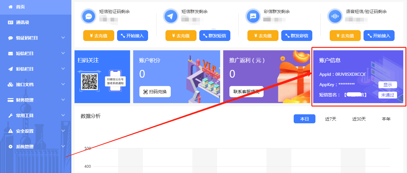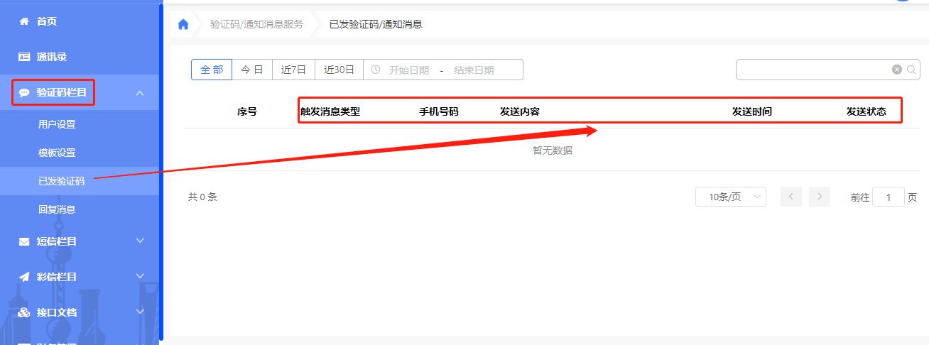 左侧菜单栏“验证码栏目”--“已发短信”可查看具体的发送数据