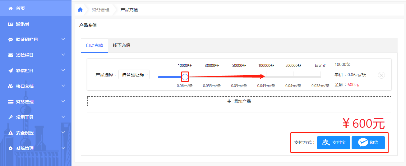 “首页”--“语音验证码”--“去充值”可自助充值,滑动进度条可自动结算出价格,注:在线充值支持:微信支付和支付宝支付。