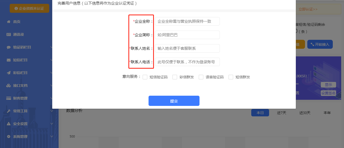 根据有关部门监管要求,企业用户需补全企业信息及营业执照,完成认证,才可使用平台全部功能。没有经过企业认证的账户,是没有权限进行短信内容的编辑。资质认证必填信息:公司名称、公司简称、公司地址、营业执照和企业logo。