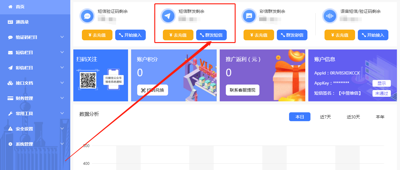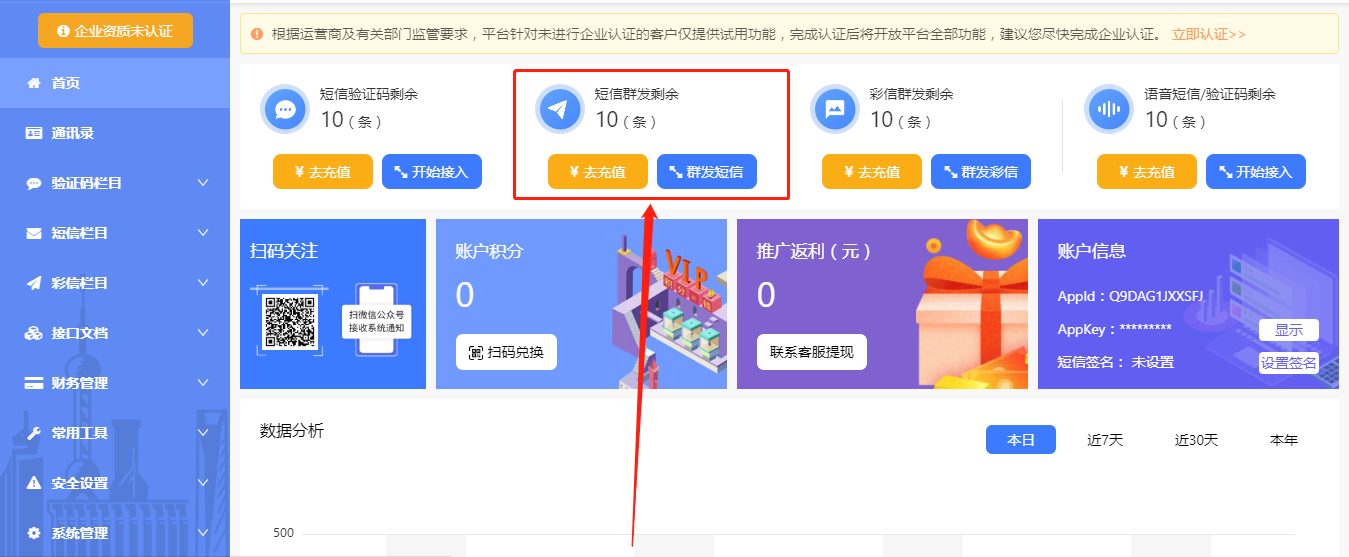 首页-“群发短信”,注:新建短信群发需要经过企业企业认证。