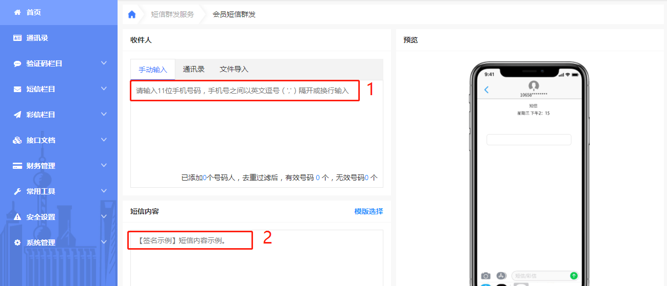 输入发送手机号,添加发送内容即可。上面有内容示例,也可以新增短信模板,新增之后,后期群发可直接选择该短信模板。