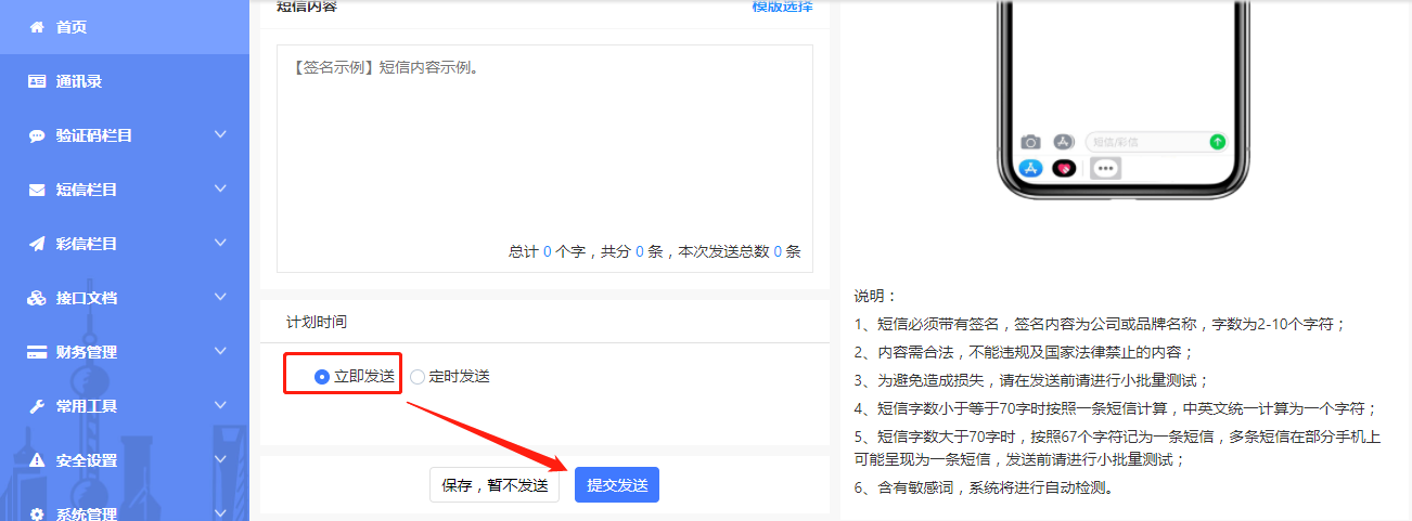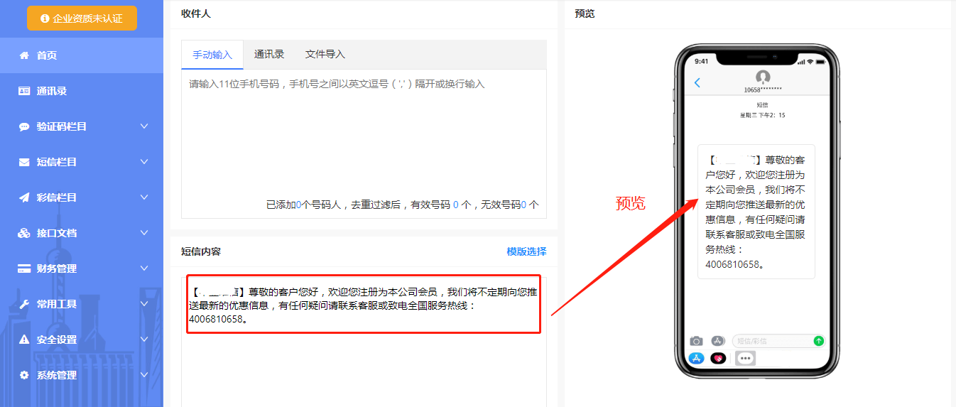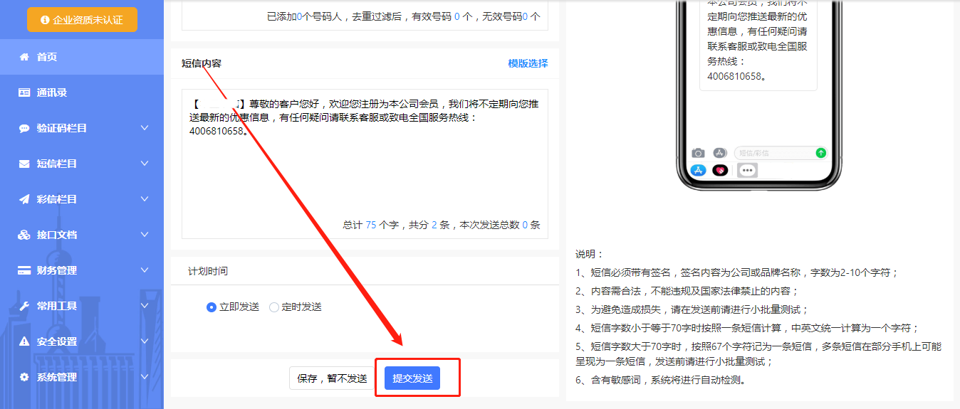 5、短信字数大于70字时,按照67个字符记为一条短信,多条短信在部分手机上可能呈现为一条短信,发送前请进行小批量测试;