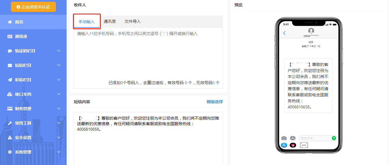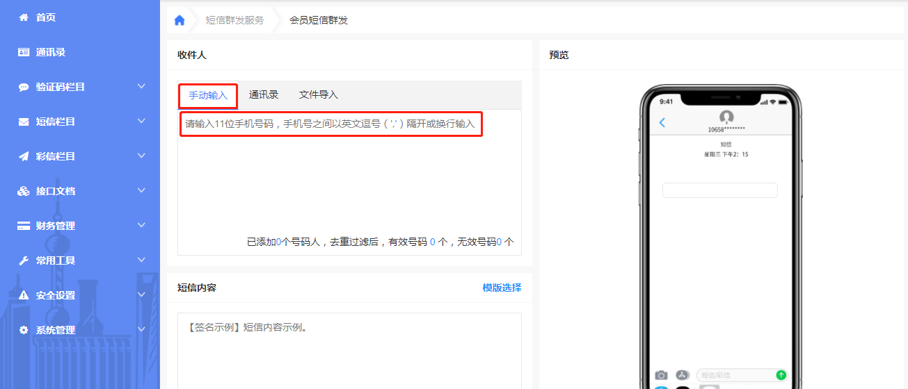 手动输入。手动输入有效的11位手机号,手机号之间用英文逗号’,’隔开。适合大量群发短信之前测试。