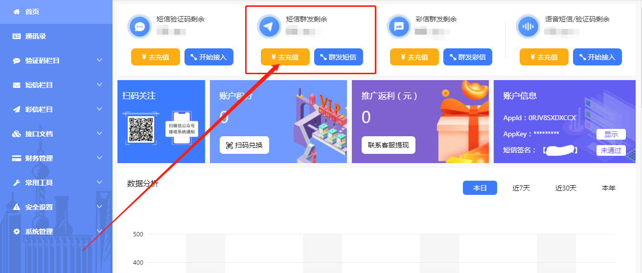 群发短信的条数充值在短彩信平台的“首页”--“去充值”即可。