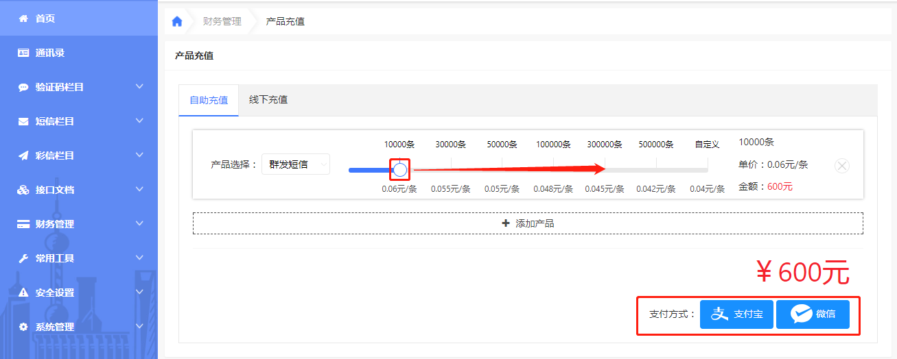 选择充值条数,滑动图中被圈的进度条到所需充值的条数下,可自动结算所付金额。注:在线充值可支持:微信支付和支付宝支付。