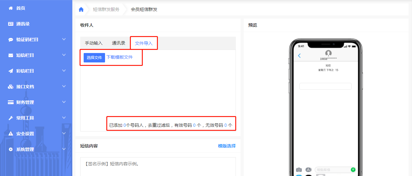 文件导入。可下载模板文件进行参考,平台会自动去掉重复号码以及空号。